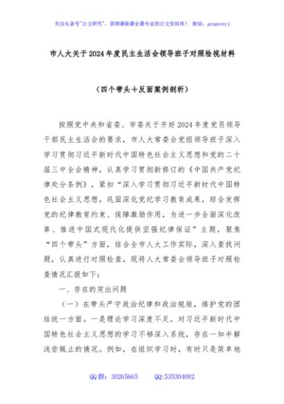 / 市人大关于2024年度民主生活会领导班子对照检视材料(四个带头+反面案例剖析)