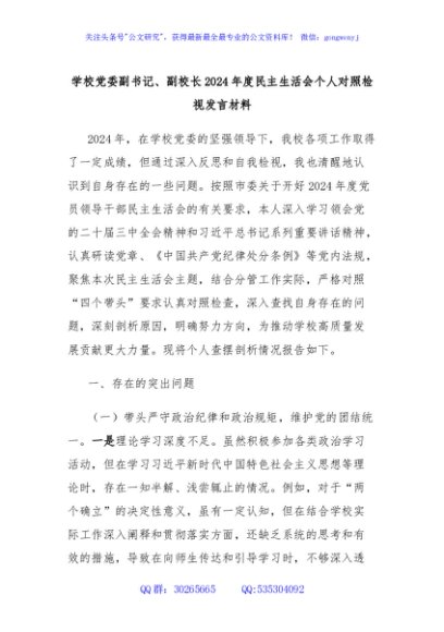 / 学校党委副书记、副校长2024年度民主生活会个人对照检视发言材料