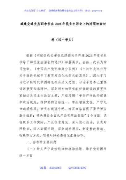 / 城建交通生态副市长在2024年民主生活会上的对照检查材料(四个带头)
