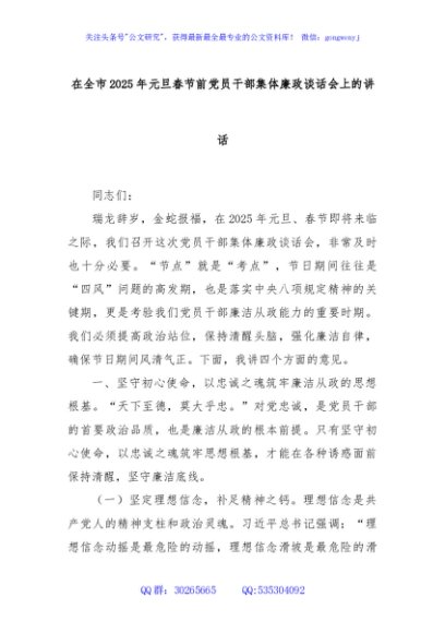 / 在全市2025年元旦春节前党员干部集体廉政谈话会上的讲话