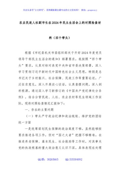 / 农业民政人社副市长在2024年民主生活会上的对照检查材料(四个带头)