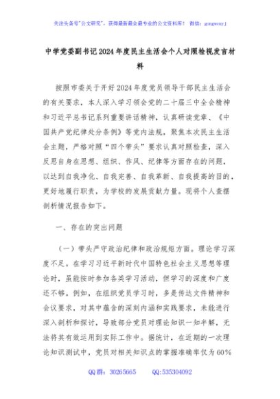 / 中学党委副书记2024年度民主生活会个人对照检视发言材料