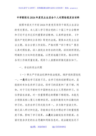 / 中学副校长2024年度民主生活会个人对照检视发言材料