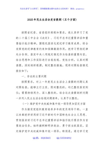 / 2025年民主生活会发言提纲(五个方面)