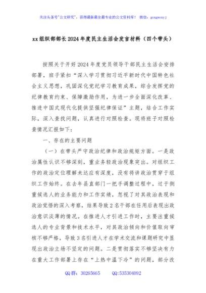 / xx组织部部长2024年度民主生活会发言材料(四个带头)