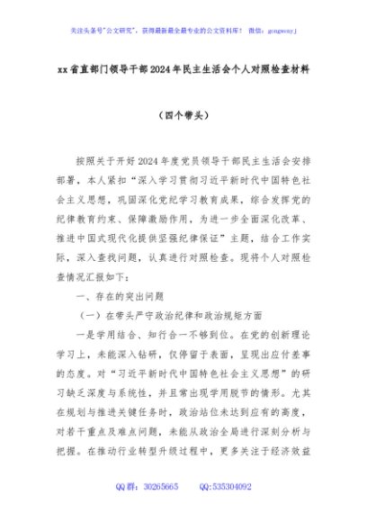 / xx省直部门领导干部2024年民主生活会个人对照检查材料