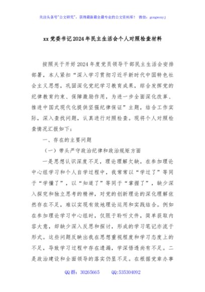 / xx党委书记2024年民主生活会个人对照检查材料