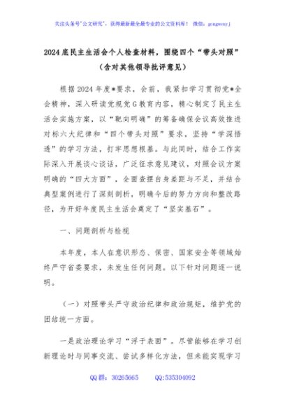 / 2024底民主生活会个人检查材料,围绕四个“带头对照”(含对其他领导批评意见)