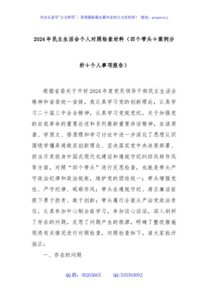 / 2024年民主生活会个人对照检查材料(四个带头+案例分析+个人事项报告)