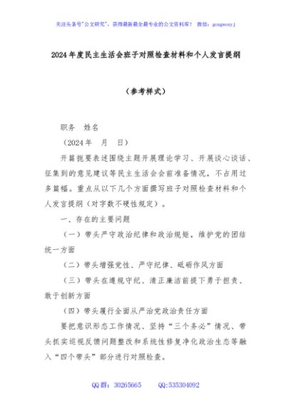 / 2024年度民主生活会班子对照检查材料和个人发言提纲(参考样式)