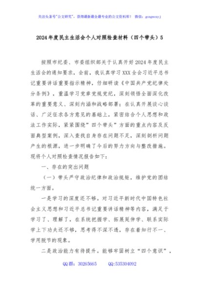 / 2024年度民主生活会个人对照检查材料(四个带头)5
