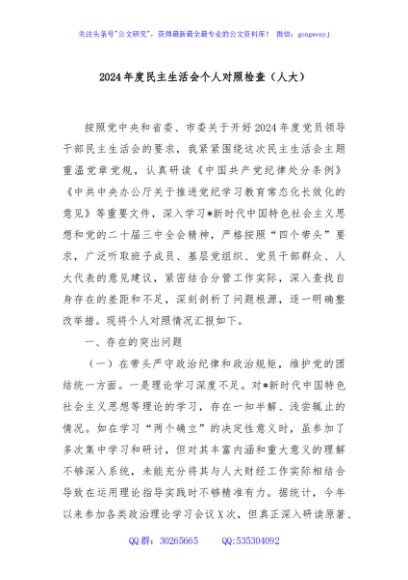 / 2024年度民主生活会个人对照检查(人大)