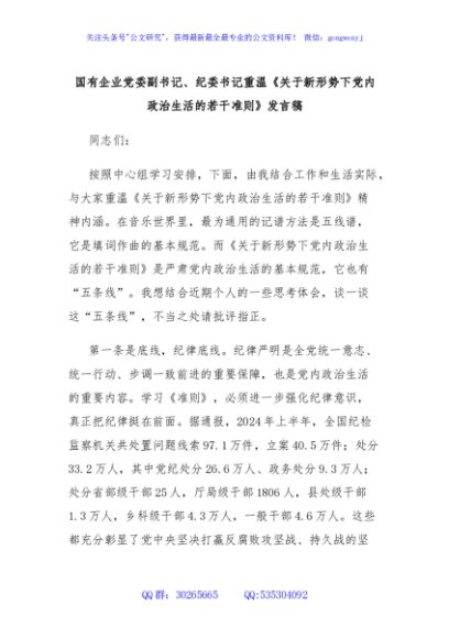 / 国有企业党委副书记、纪委书记重温《关于新形势下党内政治生活的若干准则》发言稿