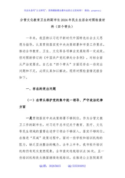 / 分管文化教育卫生的副市长2024年民主生活会对照检查材料(四个带头)