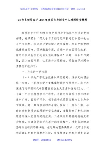 / xx市直领导班子2024年度民主生活会个人对照检查材料