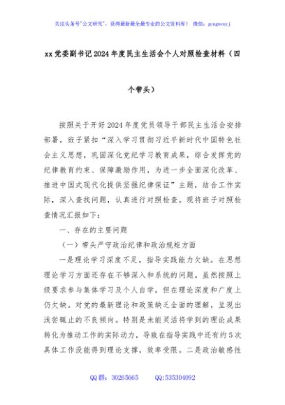 / xx党委副书记2024年度民主生活会个人对照检查材料(四个带头)