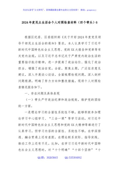 / 2024年度民主生活会个人对照检查材料(四个带头)6