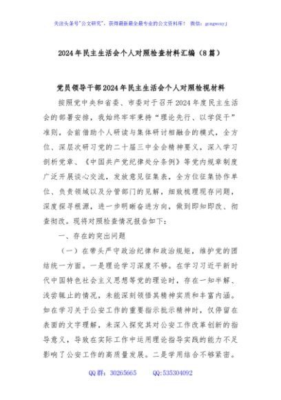 (8篇)2024年民主生活会个人对照检查材料汇编