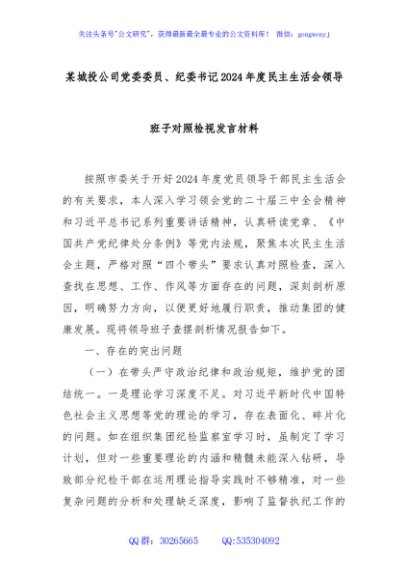/ 某城投公司党委委员、纪委书记2024年度民主生活会领导班子对照检视发言材料