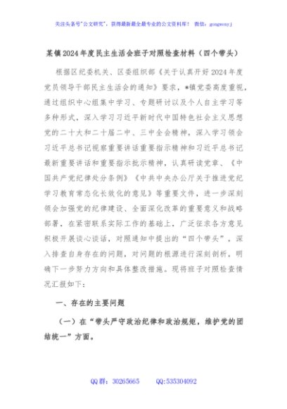 / 某镇2024年度民主生活会班子对照检查材料(四个带头)