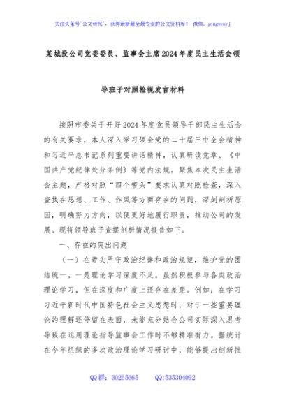 / 某城投公司党委委员、监事会主席2024年度民主生活会领导班子对照检视发言材料