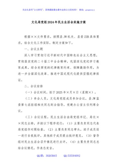 / 文化局党组2024年民主生活会实施方案