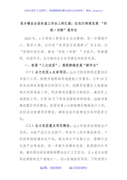 / 某乡镇在全县务虚工作会上的汇报:红色引领谋发展 “四抓·四新”展作为