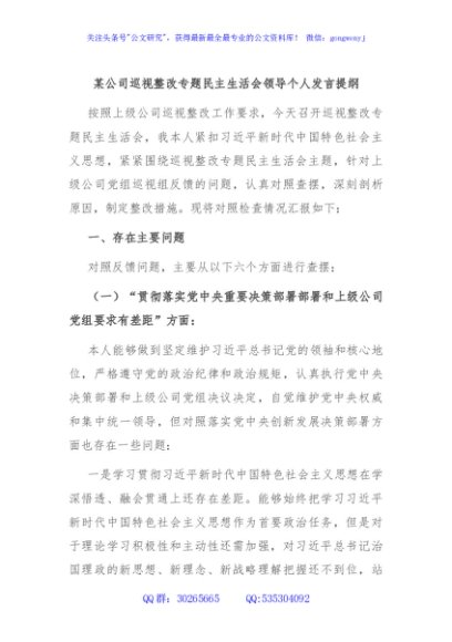 / 某公司巡视整改专题民主生活会领导个人发言提纲