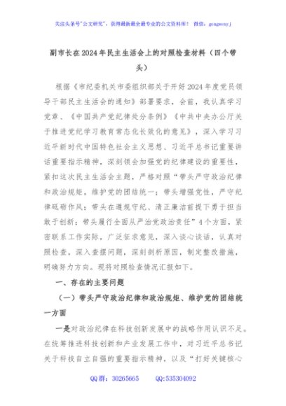 / 副市长在2024年民主生活会上的对照检查材料(四个带头)
