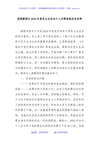 / 医院副院长2024年度民主生活会个人对照检视发言材料