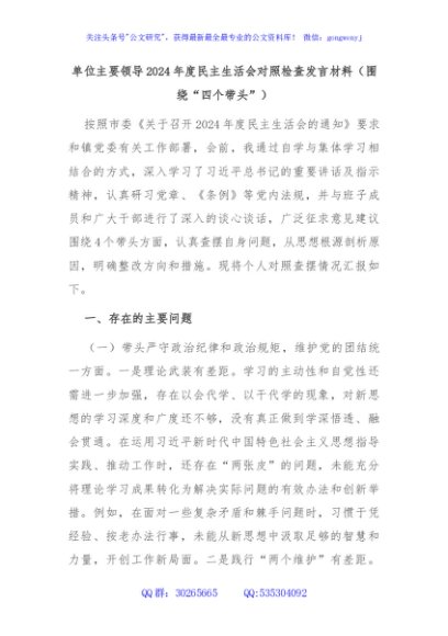 / 单位主要领导2024年度民主生活会对照检查发言材料(围绕“四个带头”)