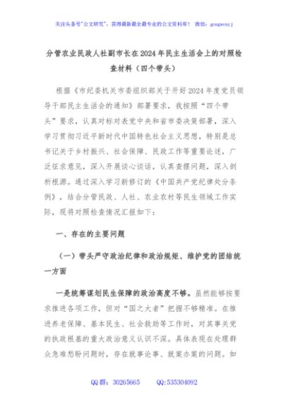 / 分管农业民政人社副市长在2024年民主生活会上的对照检查材料(四个带头)