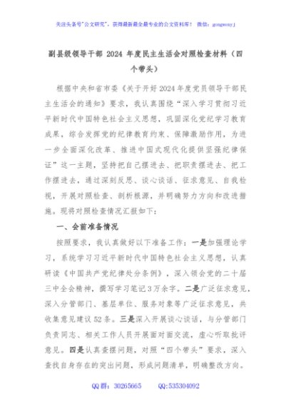 / 副县级领导干部 2024 年度民主生活会对照检查材料(四个带头)