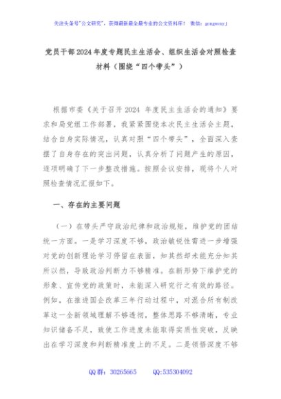 / 党员干部2024年度专题民主生活会、组织生活会对照检查材料(围绕“四个带头”)