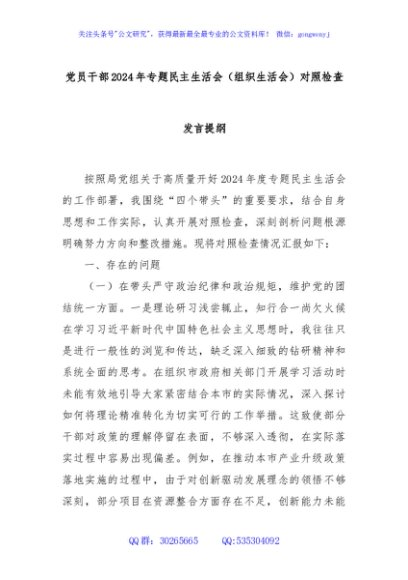 / 党员干部2024年专题民主生活会(组织生活会)对照检查发言提纲