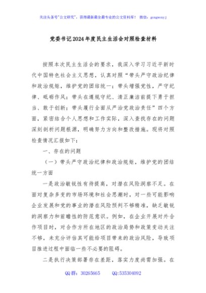 / 党委书记2024年度民主生活会对照检查材料