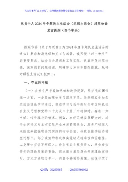 / 党员个人2024年专题民主生活会(组织生活会)对照检查发言提纲(四个带头)