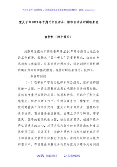 / 党员干部2024年专题民主生活会、组织生活会对照检查发言材料(四个带头)