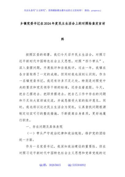 / 乡镇党委书记在2024年度民主生活会上的对照检查发言材料