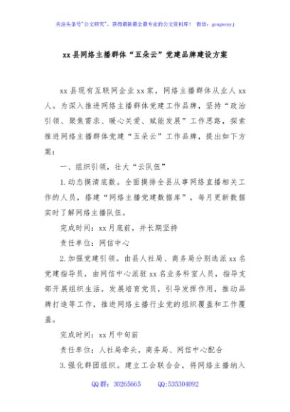 / xx县网络主播群体“五朵云”党建品牌建设方案