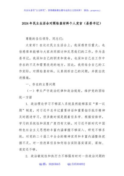 / 2024年民主生活会对照检查材料个人发言(县委书记)