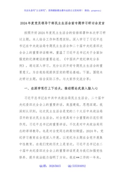 / 2024年度党员领导干部民主生活会前专题学习研讨会发言