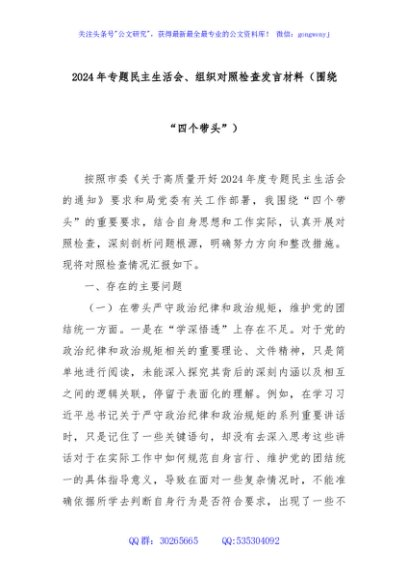 / 2024年专题民主生活会、组织对照检查发言材料(围绕“四个带头”)