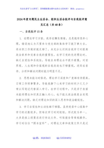 / 2024年度专题民主生活会、组织生活会批评与自我批评意见汇总(共48条)
