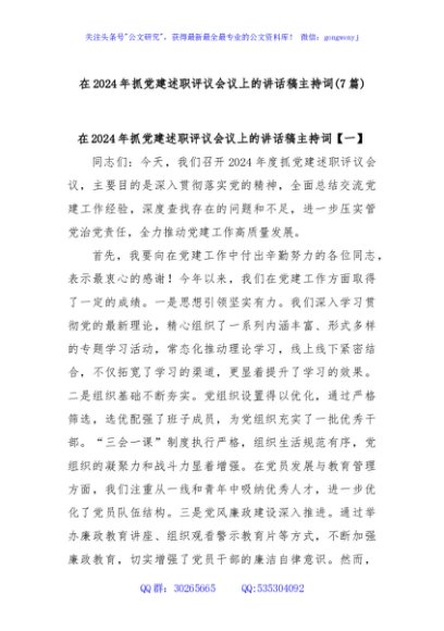 / (7篇)在2024年抓党建述职评议会议上的讲话稿主持词