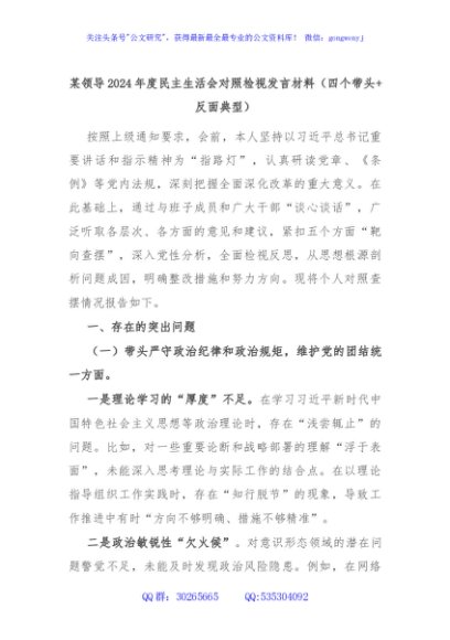 / 某领导2024年度民主生活会对照检视发言材料(四个带头+反面典型)