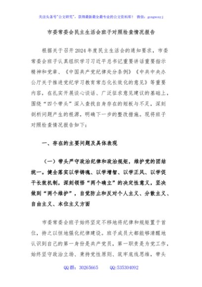 / 市委常委会民主生活会班子对照检查情况报告