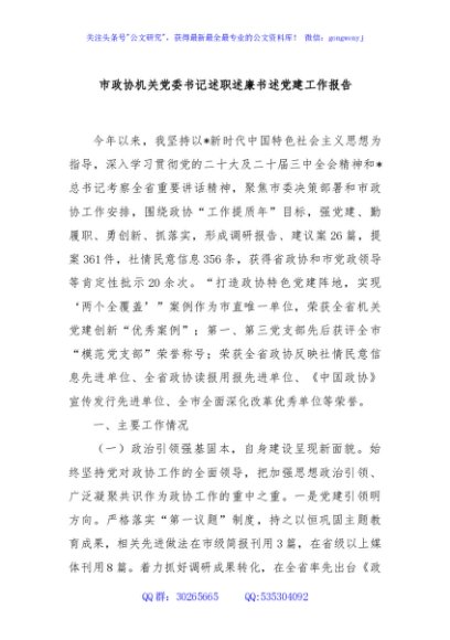 / 市政协机关党委书记述职述廉书述党建工作报告