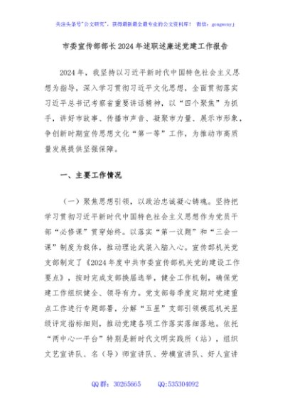 / 市委宣传部部长2024年述职述廉述党建工作报告