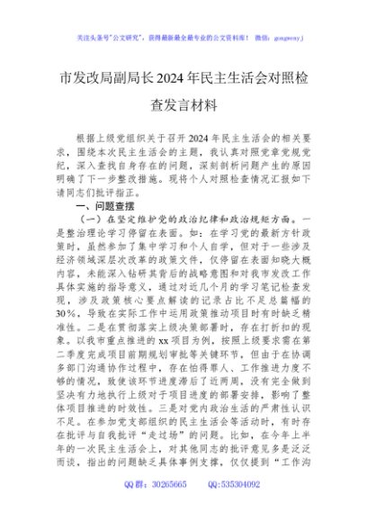 / 市发改局副局长2024年民主生活会对照检查发言材料